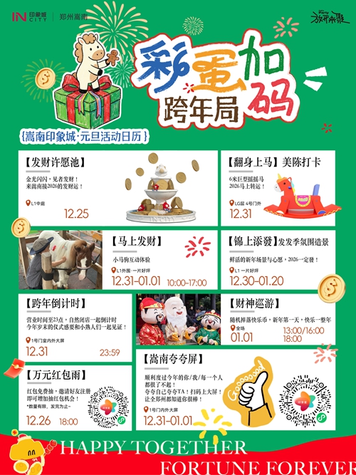 12月31日-1月3日,憑快樂幣可免費(fèi)騎小馬、抽獎、兌換零食禮包,輕松實(shí)現(xiàn)童趣與味蕾雙重滿足。跨年夜,商場營業(yè)時(shí)間延長至23:00后自然閉店,大屏同步跨年倒計(jì)時(shí),和親友一起在歡呼聲中迎接2026,氛圍感直接拉滿!